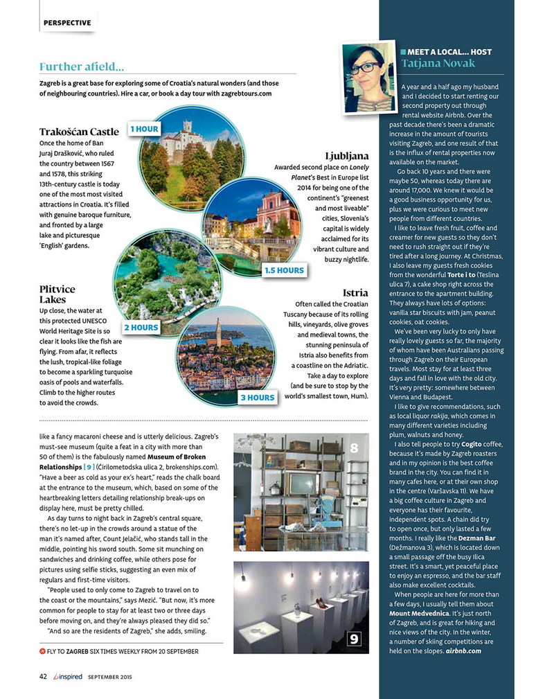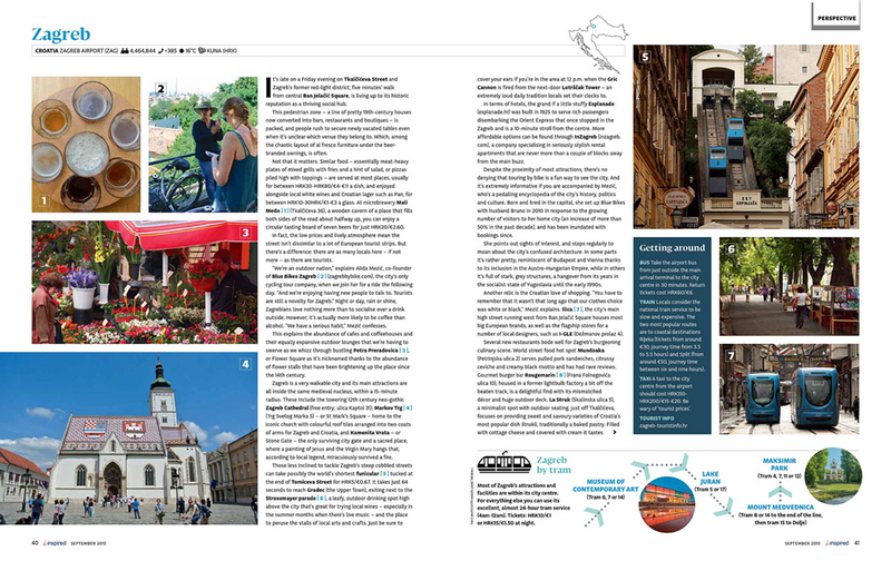 inZagreb apartments in all pocket seats of Brussels Airlines. Article on Zagreb published in their inflight magazine, that places our apartments right next to the 5-star hotel Esplanade (October 2015)